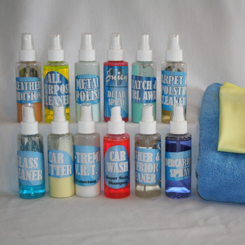 This kit includes 4oz bottles of: Car Wash Detail Spray Glass Cleaner X-treme V.R.T. All Purpose Cleaner Metal Polish Car Butter Leather Interior Cleaner Leather Conditioner Under Carriage Spray Carpet Upholstery Cleaner Scratch & Swirl Away And of course… 1 Super Plush Microfiber Towel 1 Glass Towel Customer Review Thank you for choosing to leave feedback. Please fill out this form in order to post feedback to our site. Customer feedback is important to us and it also improves buyer knowledge and overall happiness. Rate This Product (1: poor - 5: great): Title of Review: